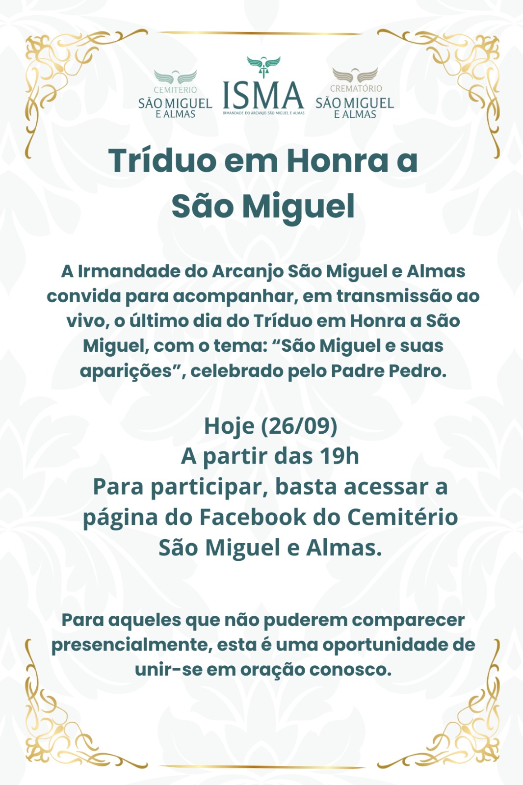 Hoje, encerramos o Tríduo em honra a São Miguel. A celebração será transmitida ao vivo pela página do Cemitério São Miguel e Almas no Facebook. Acompanhe conosco este momento especial de fé e devoção.